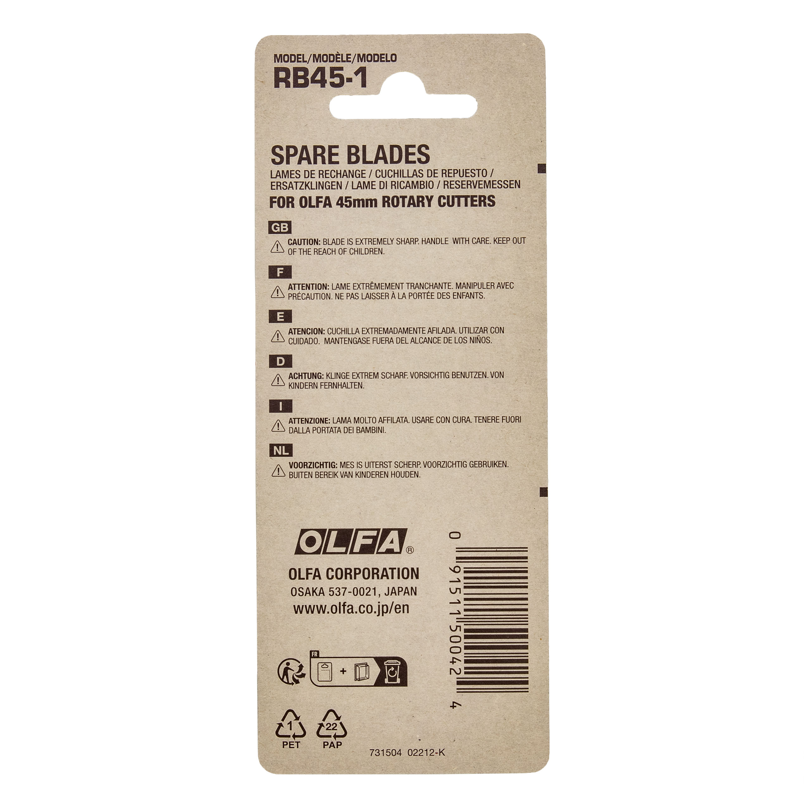 OLFA RB45H-1 – 45-mm-Klinge. Sie zeichnet sich durch längere Lebensdauer und anhaltende Schärfe im Vergleich zu herkömmlichen Klingen aus. Geeignet für: Messer der Serien RTY-2/G, RTY-2/C, RTY-2/DX und 45-C.